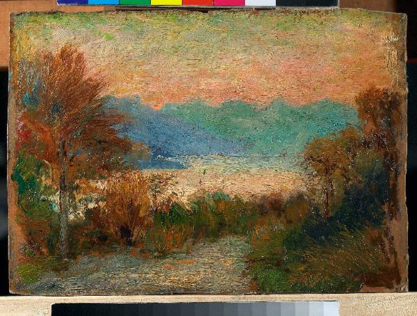 - NOTIZIE STORICO CRITICHE La luce crepuscolare avvolge il paesaggio in un'atmosfera calda in cui il riverbero dell'acqua funge da caleidoscopio che moltiplica gli effetti luminosi. I toni del rosa e del giallo si avvicendano in un gioco di rifrangenze nel quale è coinvolta anche la vegetazione. C'è tutto il sentimento di un artista malinconico in questa piccola tavola che, come le molte altre dello stesso formato, era semplicemente definita dal pittore "un'impressione", proprio per rimarcarne la velocità esecutiva, necessaria a tradurne l'emotività di un momento (Boletti, 2007, p. 60).