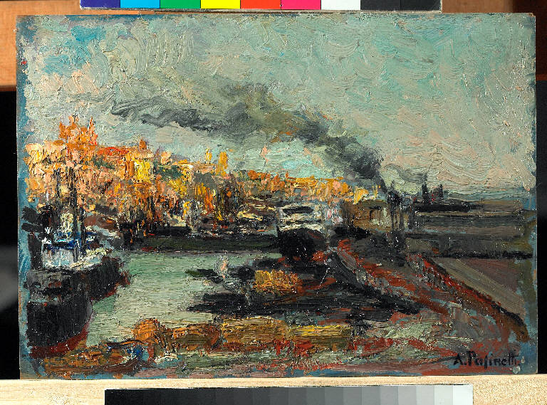 - NOTIZIE STORICO CRITICHE Antonio Pasinetti affronta raramente il tema della rappresentazione urbana, prediligendo paesaggi di montagna o di mare; nella sua produzione gli unici dipinti dedicati alla città sono quelli che raffigurano centri portuali, quali Genova e Copenaghen. In questo porto di Genova il profilo urbano digradante è così serrato che gli edifici sono ridotti a masse di colore, accostate e sovrapposte, sulle quali incombe il grigiore fumoso delle ciminiere ad evocare il fermento lavorativo, la confusione e la vivacità commerciale del porto (Boletti, 2007, p. 85).