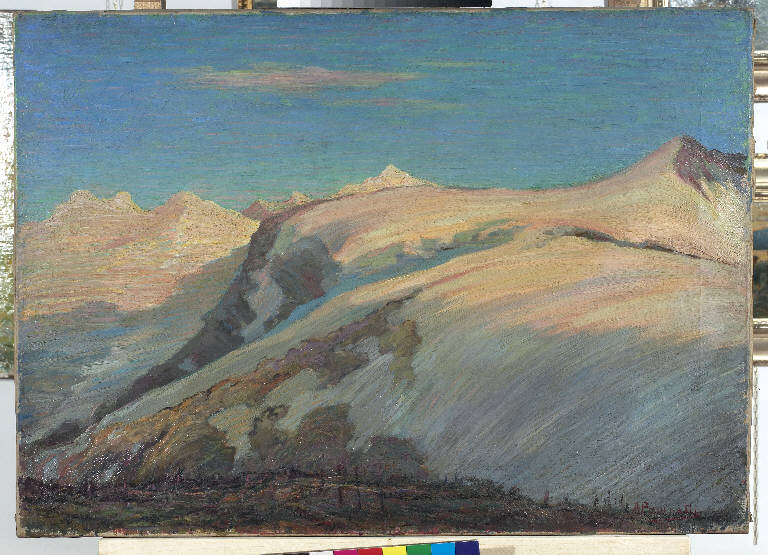 - NOTIZIE STORICO CRITICHE Scaldato dalla luce, il ghiacciaio osservato dalla Stelvio, diviene cangiante di rosa, giallo e azzurro; i filamenti stratificati di colore generano una luminosità vibrante ed un'atmosfera cristallina. La tessitura pittorica e il paesaggio d'alta quota inseriscono Antonio Pasinetti nel percorso artistico tracciato da Filippo Carcano negli anni ottanta dell'Ottocento e poi rimeditato in chiave divisionista da numerosi pittori, fra cui due amici di Pasinetti: Giovanni Segantini ed Emilio Longoni, ai quali l'artista di Montichiari si ispira anche per la scelta degli itinerari montani (Boletti, 2007, p. 87).