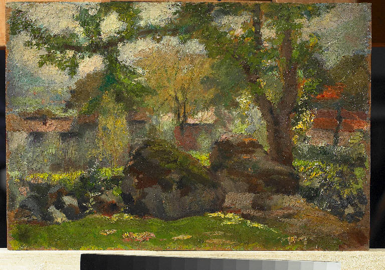 - NOTIZIE STORICO CRITICHE Un soggetto in apparenza semplice come una fila di massi di pietra è qualificato sapientemente attraverso un amalgama di tocchi densi che evocano la materia. Lo sfondo del bozzetto invece è costruito con una combinazione di pochi colori ed una modulazione svariata di toni. Qui i colpi di spatola creano contorni indefiniti che riproducono l'impressione sfocata della lontananza (Boletti, 2007, p. 103).