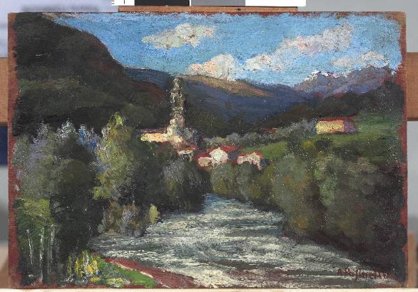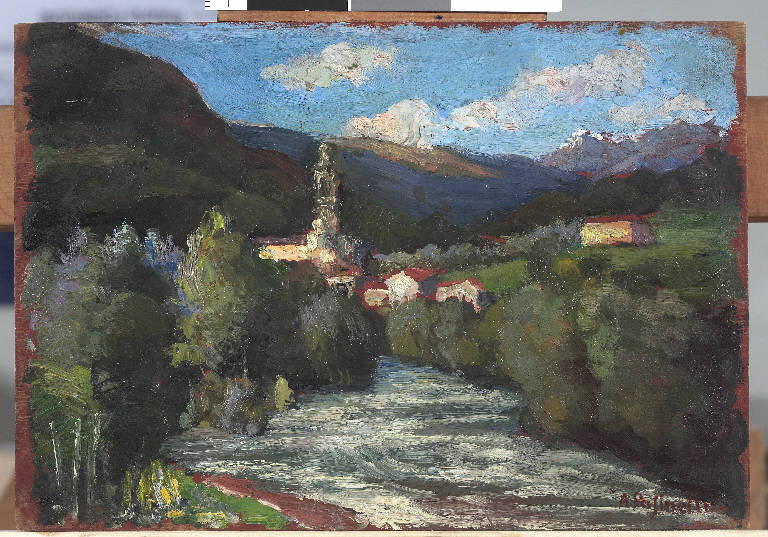 - NOTIZIE STORICO CRITICHE Il dipinto è preparatorio ad una tavola di maggiore formato (Inv. PPMTA00049) che rappresenta il medesimo brano paesaggistico della Val Camonica. L'opera finita fu presentata alla XV Biennale di Venezia del 1926.