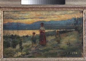- NOTIZIE STORICO CRITICHE Il crepuscolo annuncia che la giornata volge al termine: per la donna e i bambini è il momento della preghiera. Il paesaggio avvolge i personaggi appena abbozzati in una fusione che evoca l'armonia del creato. Il tono contemplativo del dipinto è enfatizzato da un'atmosfera acquerellata che si accende nel cielo infuocato e torna delicata sul lago placido. Lo studio artmosferico si avvicina allo stile dei pittori scapigliati, in particolare a Leonardo Bazzaro e Cesare Tallone che in numerosi paesaggi creano ambienti fluidi, impiegando colori assai diluiti (Boletti, 2007, p. 20).