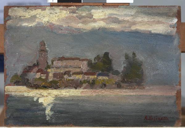 - NOTIZIE STORICO CRITICHE L'isola dei Pescatori, perno della composizione, emerge al centro del dipinto per la tessitura cromatica vibrante, in contrasto con le pennellate morbide che delineano i monti e le acque scure del lago, increspate solo da una lumeggiatura bianca.