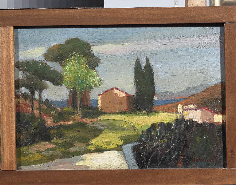 - NOTIZIE STORICO CRITICHE Nel bozzetto che ritrae dal vero uno scorcio dell'isola d'Elba, Antonio Pasinetti accosta impasti densi creando opposizioni cromatiche in seguito disciplinate\nnell'opera realizzata in atelier (Inv. PPMTE00105).