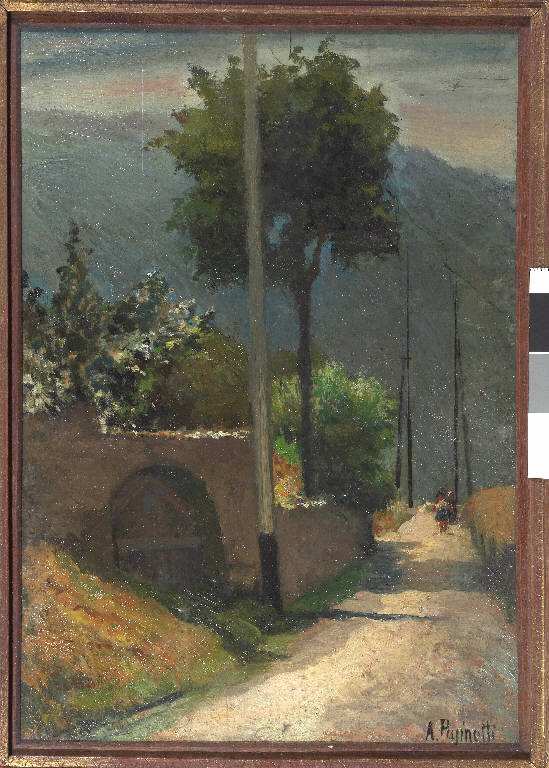 - NOTIZIE STORICO CRITICHE Il pittore indaga l'aspetto luministico infondendo particolare cura al viottolo assolato cadenzato dalle ombre della rete elettrica e della cinta muraria. Gli alberi e le figure sullo sfondo aggiungono un tono descrittivo alla scena.