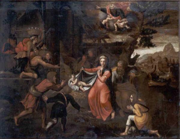 Il centro della composizione è costituito dal Bambino avvolto in un telo bianco dalla Madre che lo mostra ai pastori. Seduto al fianco della Vergine è dipinto San Giuseppe col braccio sinistro appoggiato a uno sperone di roccia, mentre intorno alla Sacra Famiglia sono disposti i pastori genuflessi. La composizione è immersa nel paesaggio naturalistico: sulla sinistra un edificio classico chiude la scena e sulla destra in secondo piano è raffigurata la città di Gerusalemme. Il dipinto è dominato dalla figura di Dio Padre che appare tra le nuvole accompagnato da una coppia di angiolletti. I toni sono cupi, le tinte dominanti sono il bruno e il rosso.