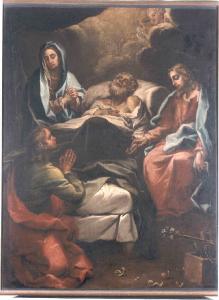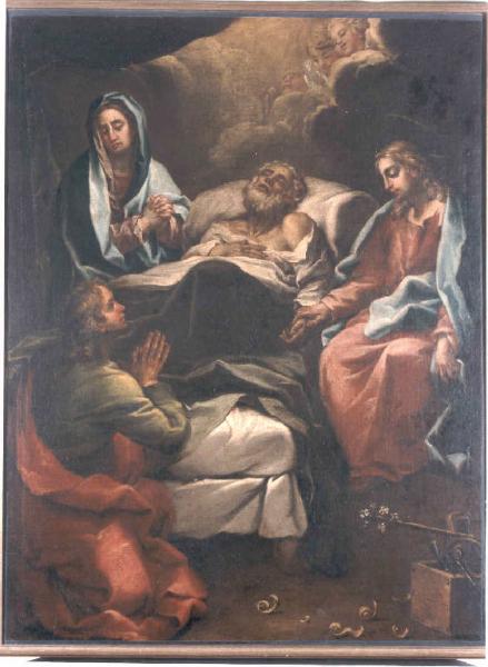 Al centro, sdraiato sul letto, san Giuseppe morto. A sinistra Madonna in preghiera; a destra, Cristo tiene la mano del padre. Ai piedi del letto, inginocchiato di spalle, san Giovanni Evangelista e alla sua destra la cassetta con gli strumenti da falegname, trucioli di legno e la verga fiorita. In alto, due volti di angeli.