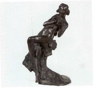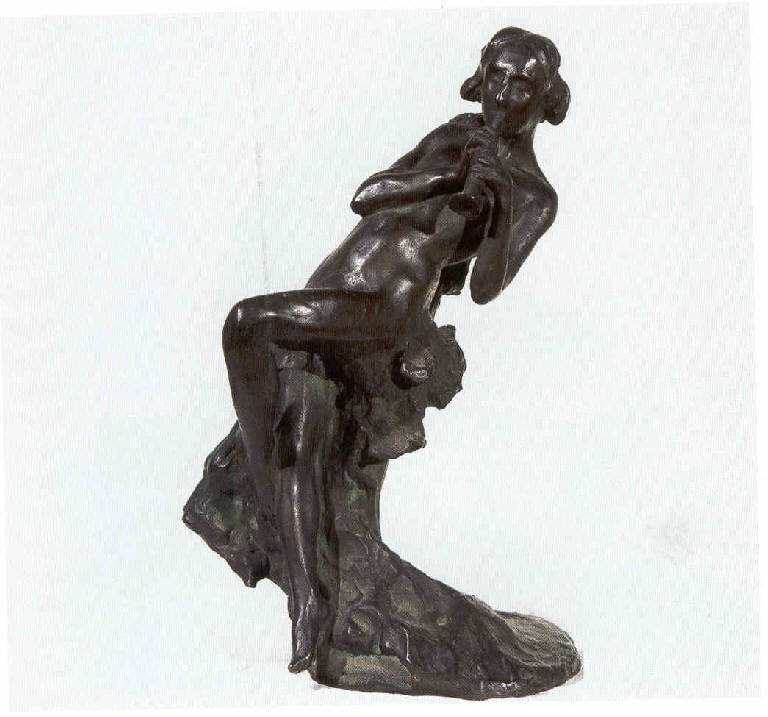 Personaggio maschile nudo, a figura intera, suona il flauto appoggiato ad un tronco d'albero. Schiena inarcata all'indietro, gambe incrociate.