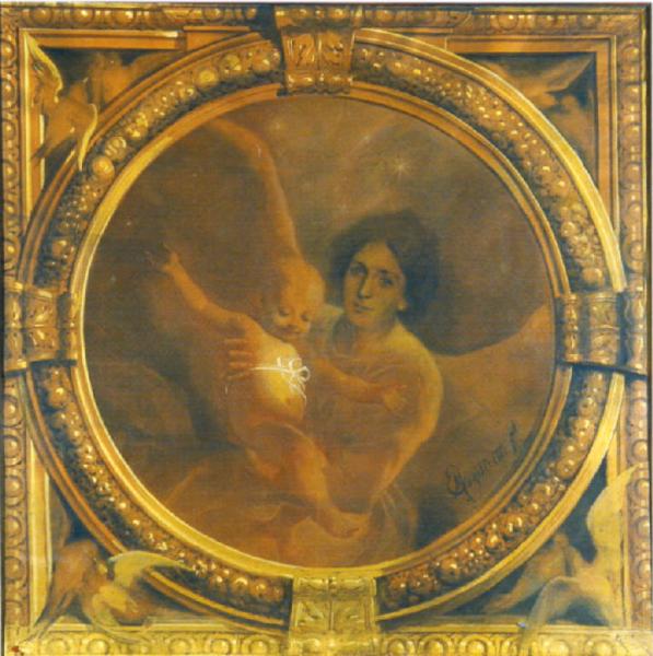 Entro un tondo centrale, personaggio femminile a mezza figura, panneggiato ed alato regge tra le braccia un bambino, cinto all'altezza della vita da un nastrino bianco. Il tondo è circondato da una serie di cornici dipinte: una prima cornice circolare è decorata con elementi vegetali (frutta) e quattro inserti di forma trapezioidale in corrispondenza dei quattro punti cardinali; agli angoli sono individuati quattro spicchi decorati con coppie di colombi. La composizione è completata da una cornice quadrata ad ovuli.