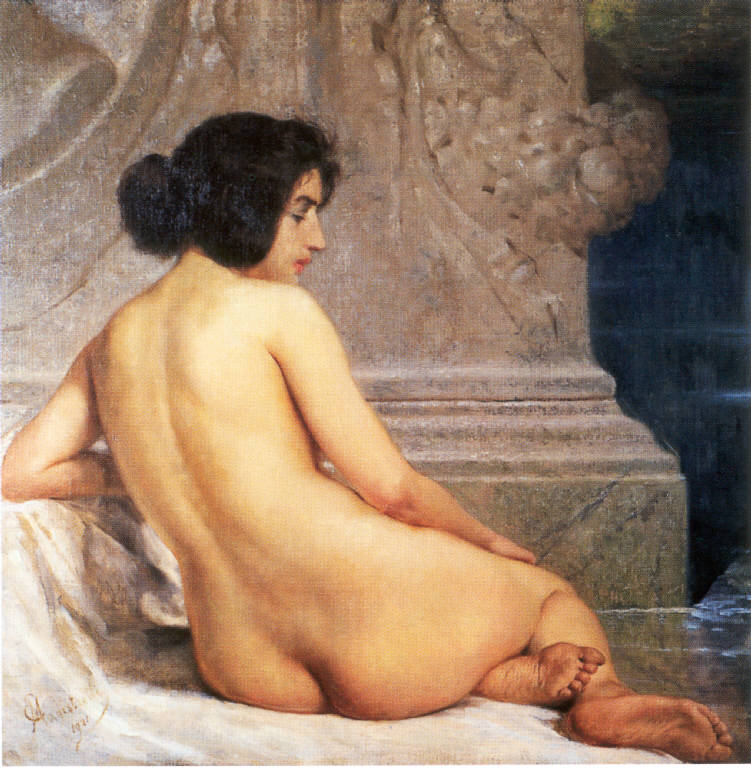 Figura femminile di schiena con il volto girato di profilo; siede su un telo bianco, inserita in contesto termale.