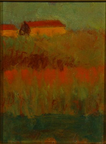 Scorcio di campagna in cui si distinguono, sullo sfondo, due case. Le diverse tipologie di vegetazione sono rese attraverso fasce di colore differente.