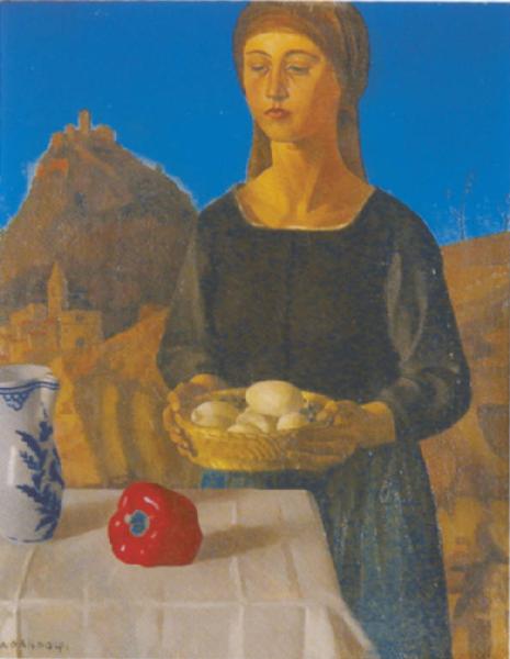 Al centro, figura fimminile in piedi, veste abiti tradizionali e regge tra le mani un cesto (contenente patate? uova?). Vicino, un tavolo con tovaglia e sopra un peperone rosso e una brocca smaltata con decorazione blu. Sullo sfondo, paesaggio tipico del centro Italia e cielo azzurro.