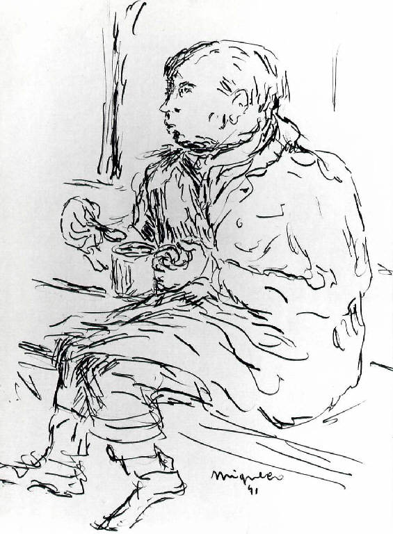 Figura maschile, seduta con le gambe accavallate, regge con la mano sinistra una tazza e con la mano destra un cucchiaino.