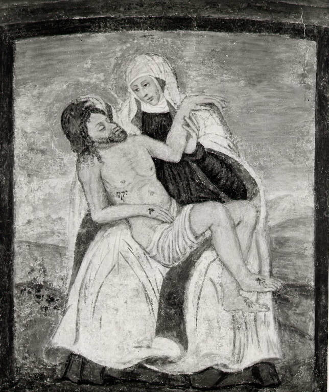 Al centro Madonna seduta con in braccio Cristo morto , veste un abito rosso e un mantello bianco all'esterno e azzurro all'intero, con ula mano sinistra regge in braccio del figlio e con la mano destra gli tocca la corona di spine. Sullo sfondo, paesaggio. Intorno bordo rosso.
