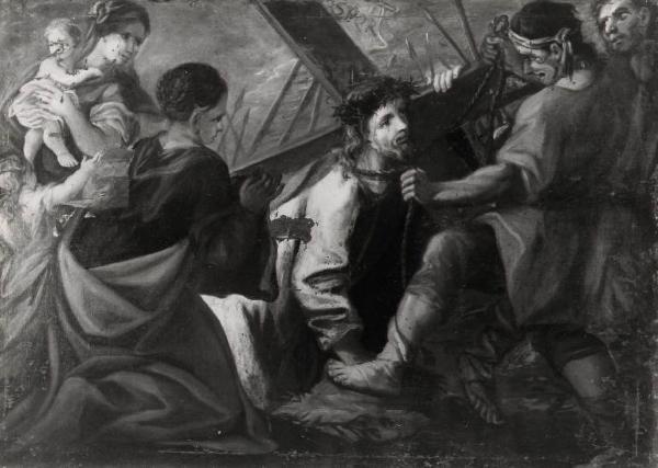 Cristo a terra sorregge la croce con la spalla sinistra, è circondato da diversi personaggi.