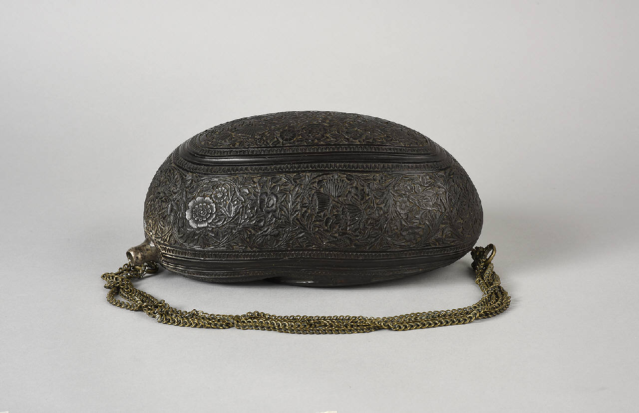 Coppa (kashkul) per la raccolta da parte dei dervisci ambulanti dell'elemosina, di forma ovoidale, ricavata in una noce di cocco di mare.