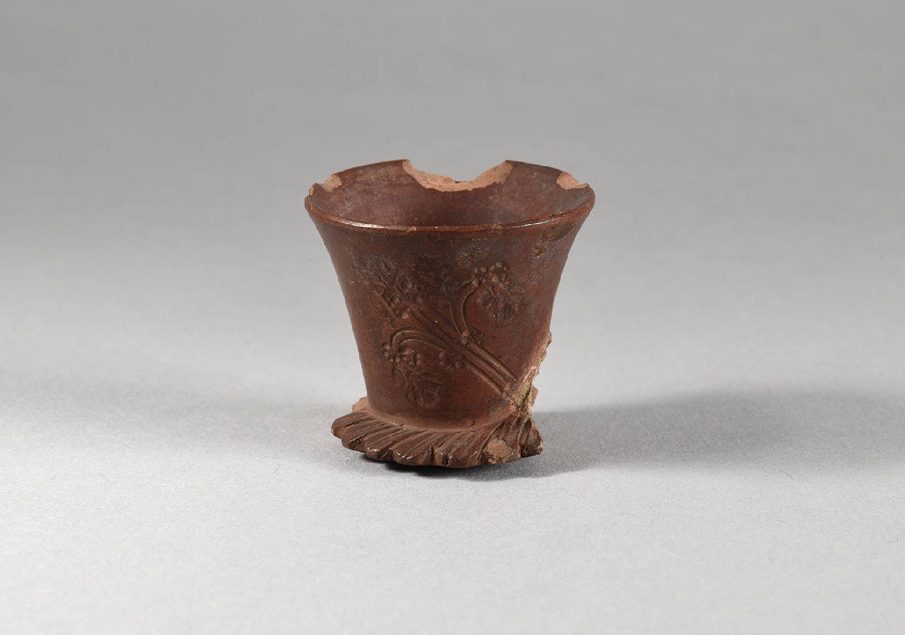 Fornello di pipa in ceramica decorato con mortivi vegetali a matrice(?). È mancante del cannello.