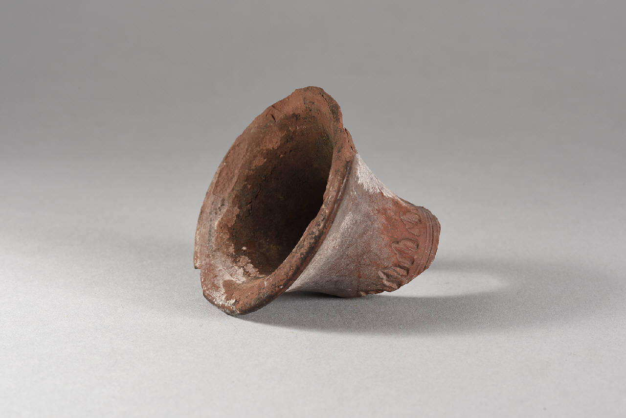 Frammento di fornello di pipa in ceramica decorato con motivi vegetali. Rimane solamente la canna del fornello.