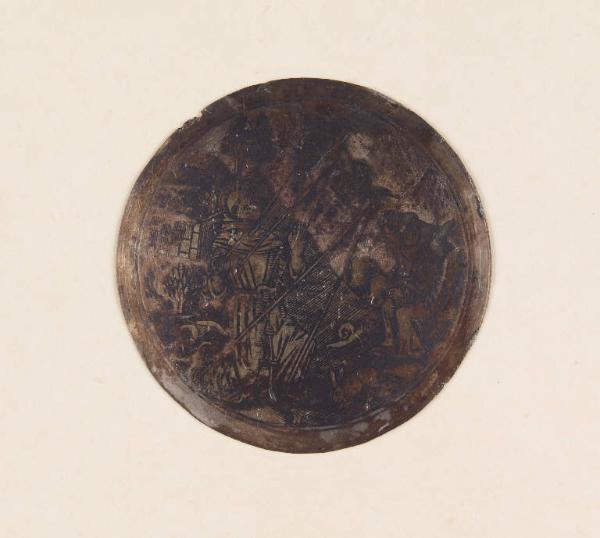 - NOTIZIE STORICO CRITICHE Il niello, conservato su un vassoio insieme ad altri pezzi e contrassegnato su di esso dal n. 22, è inserito dal Malaspina nel suo Catalogo del 1824 tra quelli "de' bassi tempi", perlopiù di forma tonda e di soggetto sacro, che andavano originariamente a decorare oreficerie liturgiche. In base alle dimensioni, al profilo doppio che circonda la composizione, e allo stile, si può avvicinare ad un altro pezzo della collezione Malaspina (si veda l'inv. St. Mal. 5386).