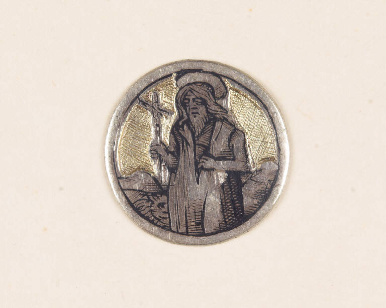 - NOTIZIE STORICO CRITICHE Il niello, conservato su un vassoio insieme ad altri pezzi dove è segnalato dal n. 24, è inserito dal Malaspina nel suo Catalogo del 1824 tra quelli "de' bassi tempi", perlopiù di forma tonda e di soggetto sacro, che andavano originariamente a decorare oreficerie liturgiche. Date le analogie con un altro niello della medesima collezione (cfr. inv. St. Mal. 5395), è possibile che decorassero un medesimo arredo sacro. Questi nielli presentano infatti lo sfondo dorato, che si è rilevato essere tipico di parte della produzione lombarda, spesso bresciana (cfr. Aldovini 2011).
