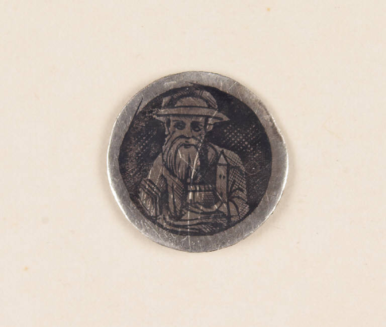 - NOTIZIE STORICO CRITICHE Il niello, conservato su un vassoio insieme ad altri pezzi e contrassegnato su di esso dal n. 31, è da identificare con uno di quelli inserito dal Malaspina nel suo Catalogo del 1824 tra quelli "de' bassi tempi", perlopiù di forma tonda e di soggetto sacro, che andavano originariamente a decorare oreficerie liturgiche.
