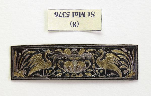 - NOTIZIE STORICO CRITICHE Questa lastrina è conservata su un vassoio che porta altri pezzi di analoga fattura, che il marchese Malaspina riteneva realizzati con la tecnica dell'agemina e destinati a decorare oggetti non meglio identificati (si vedano gli altri pezzi, inv. St. Mal. 5369-5384). Questa lastrina in particolare è simile ad un'altra (inv. St. Mal. 5372): i sette fori visibili erano appunto destinati a fissarle ad un'altra superficie. Potrebbe anche darsi che i pezzi derivino tutti da un medesimo oggetto smontato (magari una scatola?). \nE' difficile stabilire una datazione, potrebbe anche trattarsi di manifattura sette-ottocentesca.