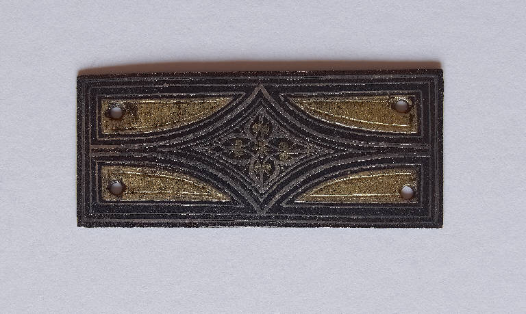 - NOTIZIE STORICO CRITICHE Questa lastrina è conservata su un vassoio che porta altri pezzi di analoga fattura, che il marchese Malaspina riteneva realizzati con la tecnica dell'agemina e destinati a decorare oggetti non meglio identificati (si vedano gli altri pezzi, inv. St. Mal. 5369-5384). Questa lastrina in particolare è simile ad un'altra (inv. St. Mal. 5379): i quattro fori visibili erano appunto destinati a fissarle ad un'altra superficie. Potrebbe anche darsi che i pezzi derivino tutti da un medesimo oggetto smontato (magari una scatola?). \nE' difficile stabilire una datazione, potrebbe anche trattarsi di manifattura sette-ottocentesca.