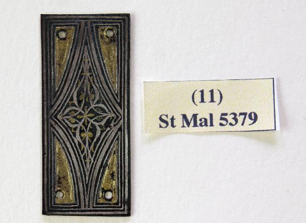 - NOTIZIE STORICO CRITICHE Questa lastrina è conservata su un vassoio che porta altri pezzi di analoga fattura, che il marchese Malaspina riteneva realizzati con la tecnica dell'agemina e destinati a decorare oggetti non meglio identificati (si vedano gli altri pezzi, inv. St. Mal. 5369-5384). Questa lastrina in particolare è simile ad un'altra (inv. St. Mal. 5378): i quattro fori visibili erano appunto destinati a fissarle ad un'altra superficie. Potrebbe anche darsi che i pezzi derivino tutti da un medesimo oggetto smontato (magari una scatola?). \nE' difficile stabilire una datazione, potrebbe anche trattarsi di manifattura sette-ottocentesca.