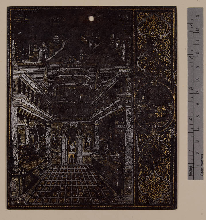 - NOTIZIE STORICO CRITICHE Questa lastra è descritta nel Catalogo Malaspina del 1824 come realizzata con la tecnica dell'agemina (si vedano anche le altre opere in tecnica analoga, conservate su un vassoio e destinate a decorare oggetti non meglio identificati, inv. St. Mal. 5369-5384). La lastra (che mostra in alto al centro un foro) raffigura in una zona più ampia a sinistra una veduta di atrio di edificio, mentre una fascia laterale verticale presenta una decorazione a racemi con un medaglione centrale raffigurante, sembra, una veduta urbana con statua equestre. Si veda anche l'altra lastra realizzata in tecnica analoga, inv. St. Mal. 5449. Secondo il marchese Malaspina, "siccome questi due pezzi devono far parte di un tutto che manca, così non si può ben riconoscerne il soggetto, che sembra però preso da qualche antico romanzo" (Catalogo 1824, IV, p. 332).