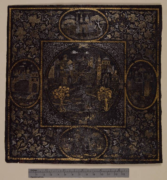 - NOTIZIE STORICO CRITICHE Questa lastra è descritta nel Catalogo Malaspina del 1824 come realizzata con la tecnica dell'agemina (si vedano anche le altre opere in tecnica analoga, conservate su un vassoio e destinate a decorare oggetti non meglio identificati, inv. St. Mal. 5369-5384). La lastra (che, diversamente dalle altre viste, non mostra fori sulla superficie) raffigura in un tondo al centro una veduta di città attraversata da un fiume, mentre in un'ampia fascia decorativa che corre tutto intorno presenta una decorazione a racemi con quattro medaglioni raffiguranti altre vedute di edifici. Si veda anche l'altra lastra realizzata in tecnica analoga, inv. St. Mal. 5429. Secondo il marchese Malaspina, "siccome questi due pezzi devono far parte di un tutto che manca, così non si può ben riconoscerne il soggetto, che sembra però preso da qualche antico romanzo" (Catalogo 1824, IV, p. 332).