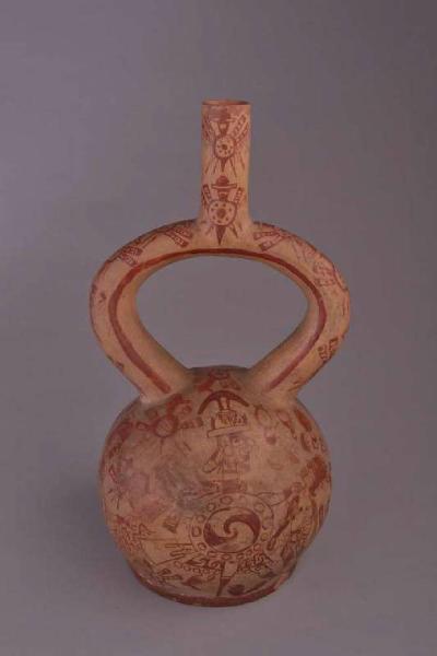 Bottiglia con camera globulare, base cilindrica, superiormente un'ansa a staffa a sezione circolare con versatoio cilindrico. Impasto fine color mattone, ingobbio color crema. La camera è decorata in bicromia (rosso e crema) con scene di guerra eseguite da due mani diverse. Quattro guerrieri moche sono raffigurati nelle diverse fasi della cattura di due prigionieri, uno dei quali, riccamente vestito, porta la tipica mazza con terminale conico. Tumi, elmi, lance, dardi, una fionda, cactus ed i simbolici fagioli sono dipinti sul fondo a rappresentare il paesaggio desertico e il campo di battaglia.