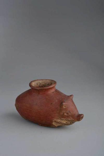 Vaso zoomorfo bicromo con camera affusolata e base convessa, superiormente un versatoio cilindrico svasato. Impasto fine color mattone con grani di mica nera. Ingobbio molto fine color mattone. L' asse del vaso è inclinato di circa 15° sulla verticale. Il vaso raffigura un pecari con il muso e le orecchie, ben pronunciate, in stile realistico e le quattro zampe stilizzate in basso rilievo. Il ventre dell'animale e l'interno del versatoio sono dipinti con vernice color crema.