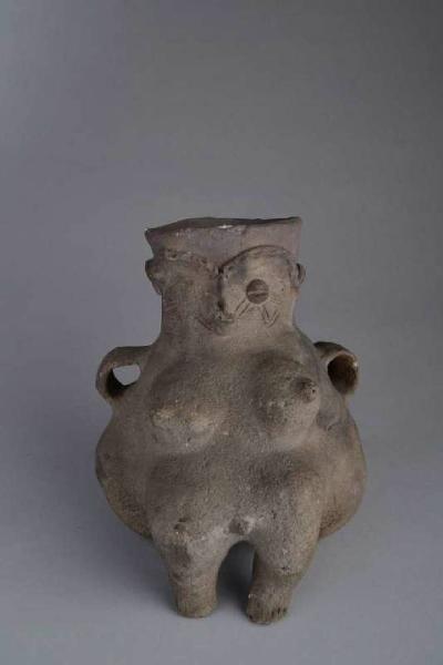 Vaso antropomorfo raffigurante una venere steatopigia, con larga apertura superiore e anse laterali. Impasto grossolano color grigio - crema con sgrassante eterogeneo molto grossolano. Il vaso rappresenta una figura femminile seduta con gambe e glutei enormi che fungono da base del vaso. Il volto presenta incisioni simulanti tatuaggi. Le sopracciglia e le orecchie sono rappresentate da due linee in rilievo, senza soluzione di continuità, che si dipartono dalla radice del naso e che sono decorate con trattini orizzontali incisi. Occhi (uno è mancante) a chicco di caffè.