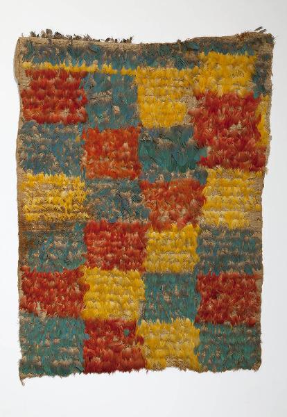 - NOTIZIE STORICO CRITICHE Potrebbe trattarsi di un frammento di camicia o di un pannello. Nel caso si tratti di pannello venivano usati come stendardi o come decorazioni appesi alle pareti. \nIn ogni caso le penne venivano tagliate per evidenziare il limite con l'altro quadrato/colore.\nIl ritrovamento può essere avvenuto in un contesto tombale/di interro rituale. \n\nIl più grande lotto di pannelli con piume mai ritrovato viene dalla zona di Arequipa (sito di Corral Redondo):\n"In February 1943, newspapers in Arequipa, in southern Peru, reported that villagers had discovered an ancient "burial ground" in a field where the Ocoña and Churunga rivers meet. The site became known as Corral Redondo, probably in reference to the three concentric circular walls, all about three feet in height and built of rough fieldstone, that were its most prominent architectural feature (redondo means "round" in Spanish). The villagers excavated an unknown number of bodies and many offerings, among them miniature objects and male and female figurines, made by the Inca (15th¿16th century).\n\nThe most spectacular objects, however, were created by the much earlier Wari people (7th-10th century): eight ceramic vessels, each three to four feet high, that together contained ninety-six large, rolled-up feathered panels. The vessels are thought to depict humans, perhaps Wari dignitaries or ancestors, with mythological imagery painted on their bodies. Most of the panels are completely covered with the fine body feathers of the blue and yellow macaw, laid out in rectangles; others are entirely yellow or blue and orange. The ties still attached to the upper corners of many of the panels suggest they were used as hangings designed to transform an interior space into a radiant ceremonial setting.\n...seems obvious that Corral Redondo was a huaca, or sacred place. It is known that the Inca used their finest textiles to cover the walls of shrines. Perhaps the Wari hung the luxurious feathered panels on the walls of the circular enclosure while they performed rituals prior to burial. Centuries later, the Inca came to the site for special ceremonies and to bury offerings to honor their gods and ancestors."\nda "Feathered Walls. Hangings from Ancient Peru". Metropolitan Museum, New York, September 16, 2013-March 2, 2014.\n\nNella zona di Ica (loc. Cerrillos) è stato trovato un fardo che conteneva un corpo femminile avvolto, negli strati esterni, da un tessuto a camicia decorato a riquadrati di piume. Tuttavia lo svolgimento dei riquadri è più orizzontale che verticale, come nel tessuto del Museo delle Culture.
