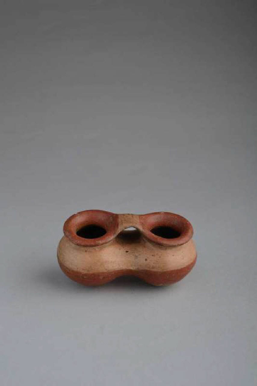 Doppia anforetta con camere non comunicanti a forma globulare a base convessa, superiormente due colletti eversi uniti da piccola ansa a ponte. Impasto medio - fine color mattone. Ingobbio fine color crema. Cottura ossidante. Esecuzione a pafddling. Decorazione a tecnica mista in tricromia (rosso, nero e crema). Negli emisferi inferiori, tra l' equatore e le calotte, corre una larga striscia orizzontale di colore rosso, che, insieme al color crema delle calotte, fa da fondo a una serie di linee nere concentriche che si dipartono dai poli meridionali realizzate ocn tecnica in negativo. Le bocche dei colletti sono dipinti in rosso, mentre il manico, di colore crema, presenta una serie di linee nere parallele.