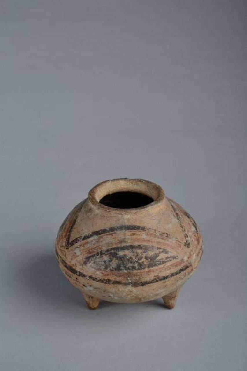 Anforetta - tripode con camera globulare, superiormente collo appena accennato, inferiormente tre piedini pieni. Impasto medio color mattone con sgrassante bianco. Ingobbio medio - fine color crema. Cottura ossidante. Esecuzione falso tornio. Piedini assemblati. Le spalle dell'anfora sono decorate con un motivo costituito da tre elementi lenticolari tratteggiati di colore nero delimitati, superiormente, da tre linee ad arco di cerchio (due rosse ed una nera) e, inferiormente da tre linee orizzontali (due nere ed una rossa) che corrono lungo l'equatore. L' orlo superiore del collo è dipinto di rosso.