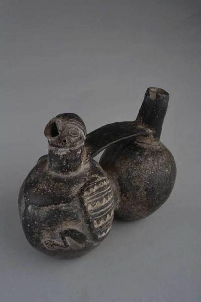 Bottiglia zoomorfa con due camere globulari a base piana circolare, raccordo ventrale, superiormente uno pseudo versatoio a forma di testa d'uccello, con il becco fratturato, ed un versatoio cilindrico uniti da manico a ponte nastriforme. Impasto fine di colore nero, ingobbio dello stesso colore. Cottura riducente. La camera con pseudo versatoio a forma di testa d'uccello raffigura (per la forma dell'occhio) un pappagallo con le zampe in bassorilievo sul ventre della camera e le ali rese a stampo (motivi dentellati e a righe). La parte mancante non permette di stabilire se si tratta di una bottiglia fischiante.
