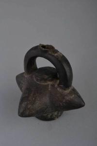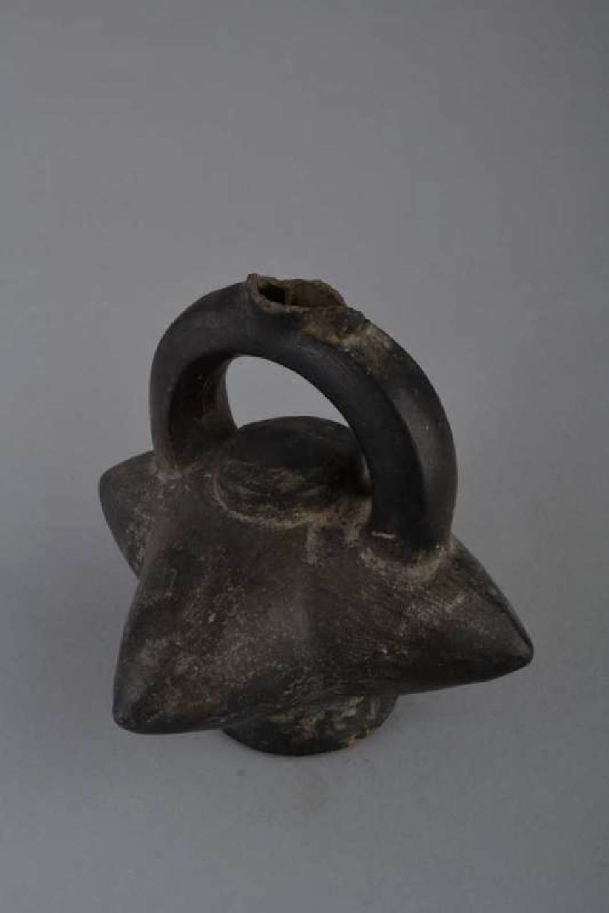 Bottiglia con ansa a staffa con camera a forma di stella a quattro punte, base tronco - conica, superiore un' ansa a sezione rettangolare; il versatoio è mancante. Impasto di colore grigio, ingobbio di colore nero. Cottura riducente. Esecuzione ad unico stampo verticale. La bottiglia raffigura la sommità di una mazza da guerra stellata e la parte superiore della relativa ammacatura.