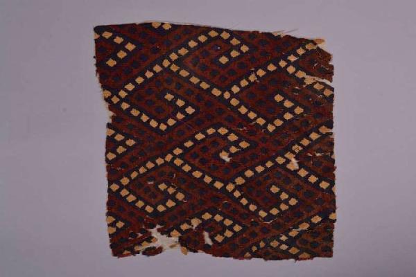 Frammento di tessuto in colore giallo e marrone su fondo scuro con largo disegno a losanghe.