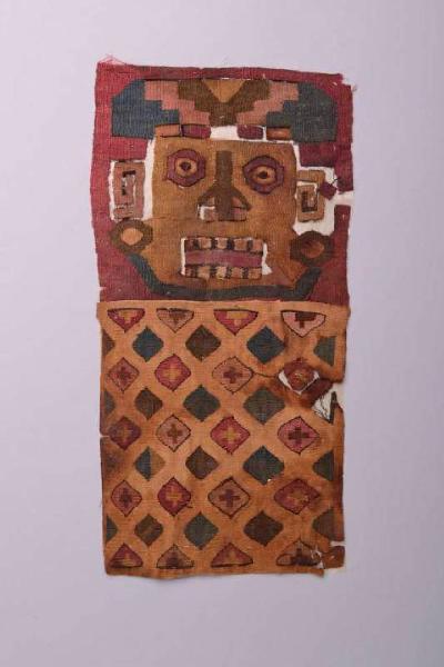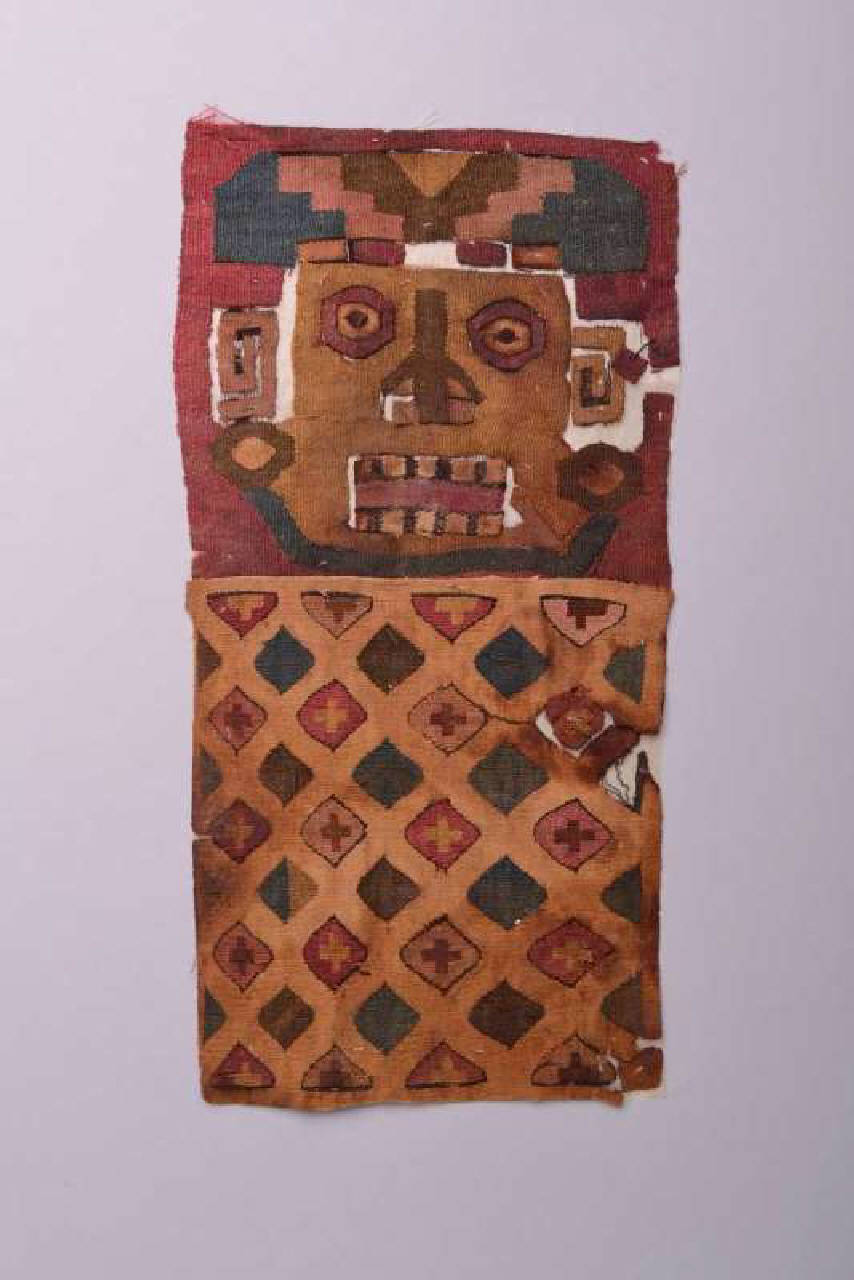 Tessuto quadrangolare rosso, giallo e azzurro con volto umano al centro.