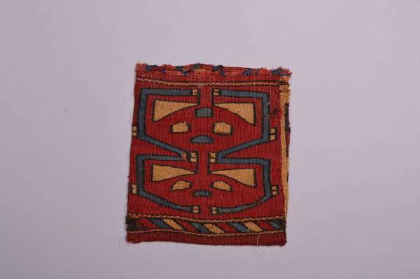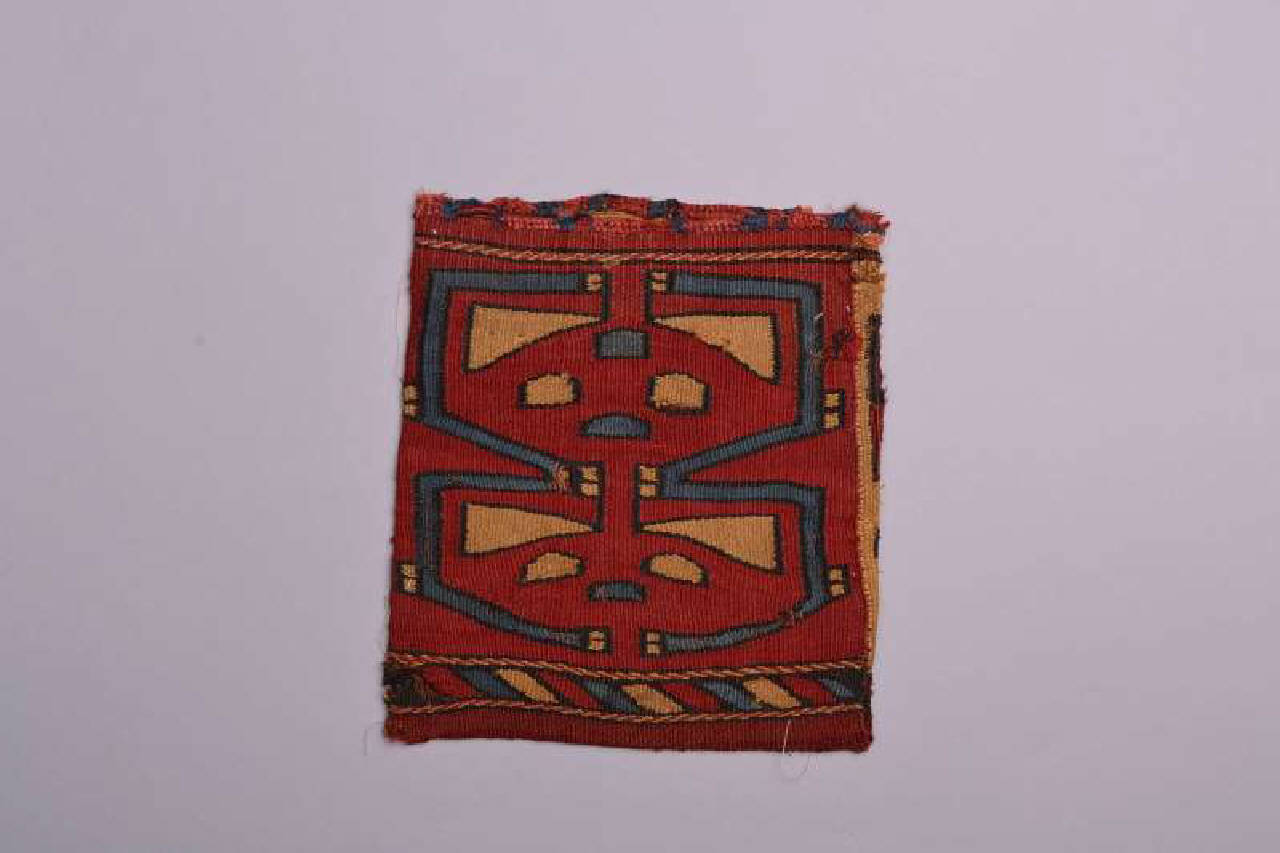 Borsa rettangolare in tessuto di lana con decorazione geometrica gialla e azzurra.