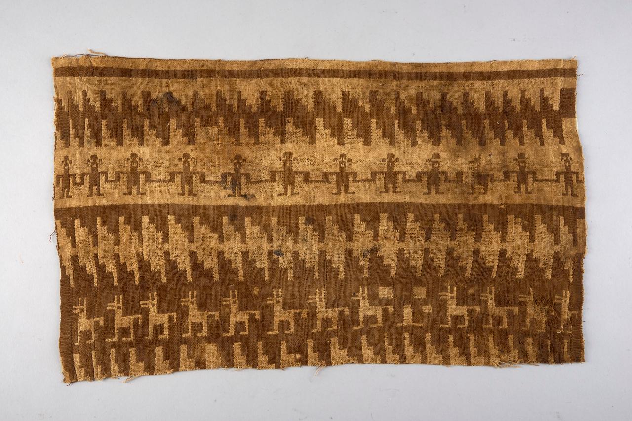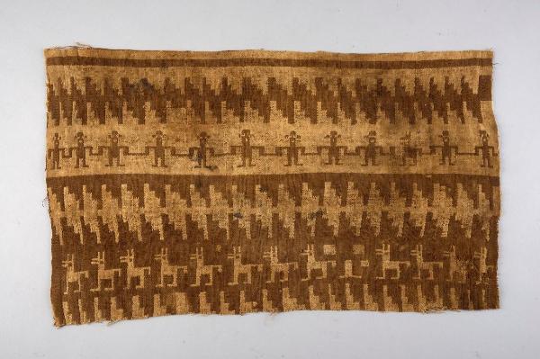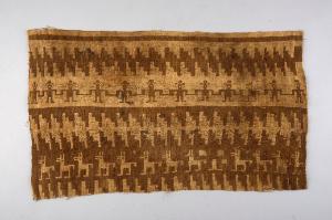 Tessuto doppio rettangolare a decorazione bruna raffigurante una danza di guerrieri. In alto e in basso meandri geometrici; più sotto una carovana di lama.