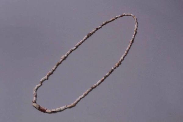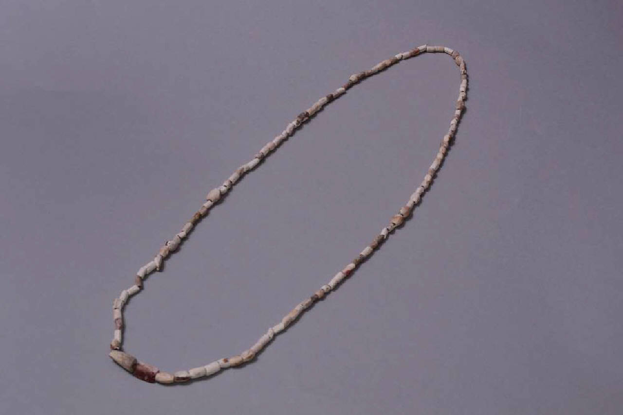 Collana costituita da piccole conterie bianche, rosse, viola. Le conterie rosse e viola sembrano di Spondylus sp. Le altre sono di pietra. Lavorazione a taglio e levigatura in modo da ottenere un corpo tubolare, quindi affettatura in dischetti e perforazione biconica o cilindrica di ciascuno di essi. Le conterie di Spondylus sp. provengono da conchiglie di grandi dimensioni. Affettatura mediante coltelli in pietra, taglio, forse, mediante sega e corda, perforazine mediante trapani tubolari. Levigatura grossolana. Il filo nel quale sono inserite le conterie è recente.