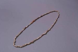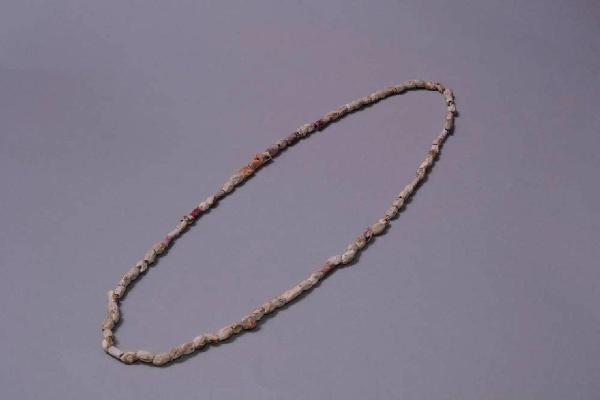 Collana costituita da piccole conterie di Spondylus sp. di colore bianco, rosso, viola. Le conterie sono ricavate da grandi conchiglie mediante taglio e perforazine e, in alcuni casi, levigatura. Le conterie violacee a forma di tubicino sembrano ottenute da grandi aculei di Spondylus sp. Perforazione biconica e cilindrica. Il filo nel quale sono inserite le conterie è recente.