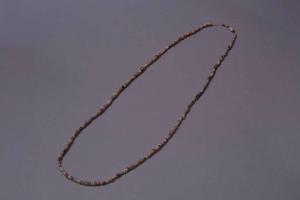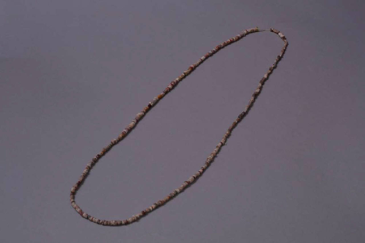 Collana costituita da piccole conterie discoidali e tubolari di conchiglia e pietra. Le prime sono di colore bianco e rosso, le seconde sono di colore verde e violetto. Alcune delle conterie lasciano intravedere la madreperla. Lavorazione a taglio e levigatura in modo da ottenere un corpo tubolare, quindi affettatura in dischetti e perforazione biconica o cilindrica di ciascuno di essi. Affettatura mediante sega a corda, perforazione mediante trapani rotanti, taglio con metodo misto: sega a corda e coltelli di petra. Il filo nel quale sono inserite le conterie è recente.