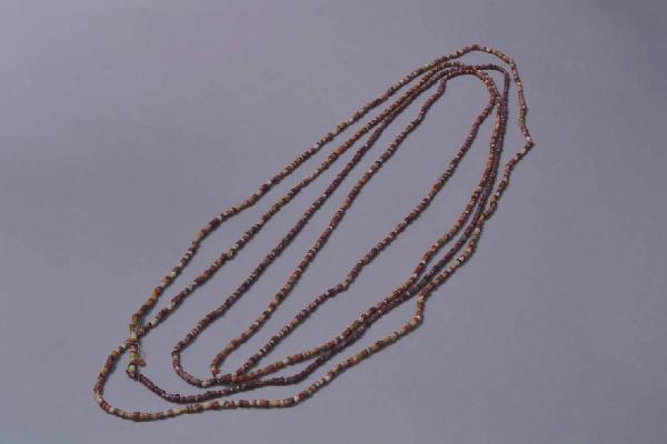 Collana costituita da piccole conterie di pietra, rosse, viola e bianche; queste ultime sono anche di conchiglia e di osso. Lavorazione a taglio e levigatura in modo da ottenere un corpo tubolare, quindi affettatura in dischetti e perforazione biconica o cilindrica di ciascuno di essi. Affettatura mediante sega a corda, perforazione mediante trapani rotanti, taglio con metodo misto: sega a corda e coltelli di petra. Il filo nel quale sono inserite le conterie è recente.