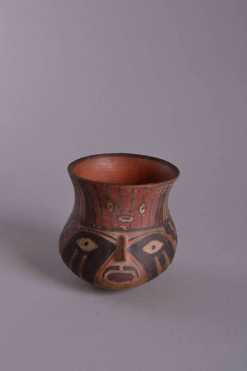 Vaso aperto svasato cefalomorfo, base leggermente convessa. Impasto fine di colore mattone (?), ingobbio di colore ocra chiaro. Cottura ossidante con imperfezioni alla base. Esecuzione a falso tornio. Rifinitura a spatola. Il vaso decorato in policromia (nero, rosso, ocra, bianco) rappresenta il viso di un guerriero con pitture facciali aviformi e con copricapo di penne che la parte centrale mette in evidenza la bocca e gli occhi di una figura, forse l' alter ego del guerriero stesso. Posteriormente presenta sei appendici (pesci ?) appese, tre a tre, alle due ultime penne del copricapo. Stile monumentale.