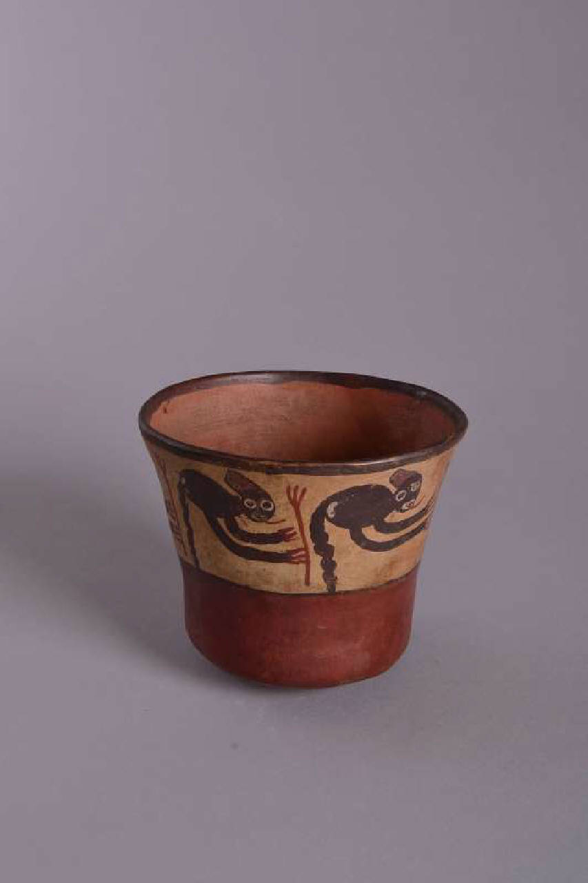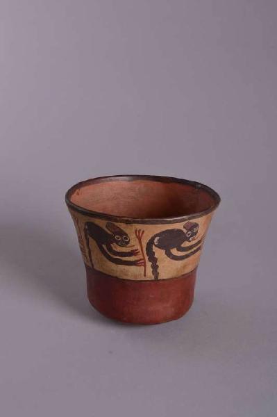 Tazza, base convessa circolare. Impasto fine, ingobbio di colore mattone. Cottura ossidante. Esecuzione a falso tornio. Rifinitura a pennello. La tazza, decorata in policromia (bianco, rosso, caffè, crema), presenta sei scimmie con copricapo, e prive delle zampe posteriori, rivolte ciascuna ad alberello fortemente stilizzato. Stile monumentale.