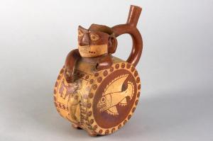 Bottiglia antropomorfa in terracotta con camera cilindrica, base quasi piana con quattro piedini di sostegno, superiormente una testa antropomorfa e braccia cave, applicate, lateralmente un'ansa a staffa cava, a sezione circolare, sormontata da un versatoio cilindrico. La bottiglia raffigura un personaggio con pitture facciali il cui corpo è costituito da un tamburo. Egli impugna con la mano destra la corda cui è attaccato un tonno che emerge dalla camera. Su una faccia del tamburo è dipinto un altro tonno in posizione di nuoto.