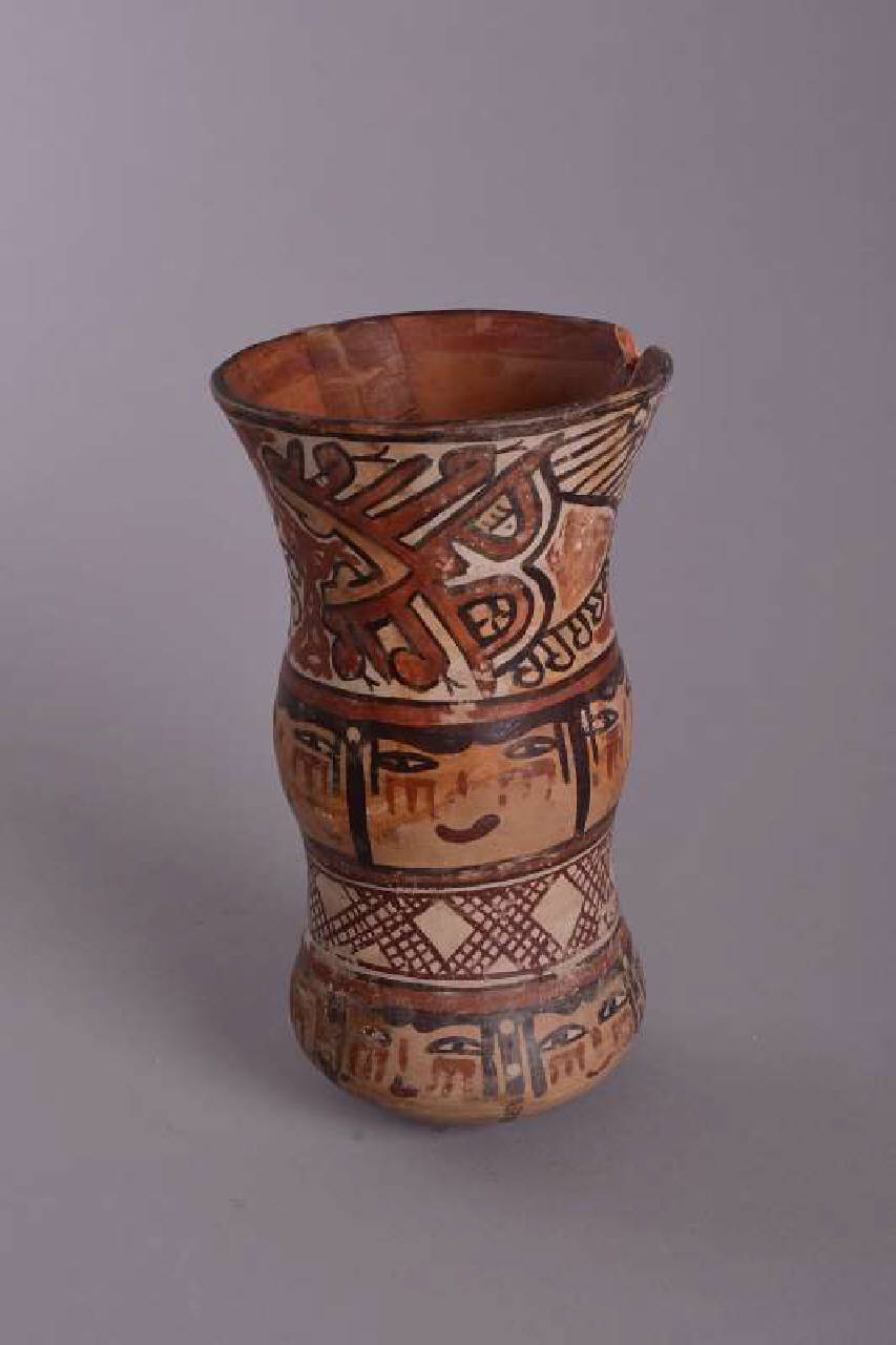 Vaso pseudocilindriforme svasato con rigonfiamento centrale, base convessa circolare. Impasto fine colore ocra, ingobbio di colore ocra chiaro. Cottura ossidante. Esecuzione a falso tornio. Il vaso diviso in quattro registri, è decorato in policromia (caffè, rosso, ocra, crema). Dall' alto verso il basso si notano i seguenti motivi: due schematizzazioni dell' Essere Mostruoso con impennatura; cinque visi di donna con pitture facciali; una decorazione geometrica; cinque visi di donna con le stesse caratteristiche dei precedenti. Stile Proliferato.